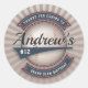Thank You Baseball Stickers features a vintage style baseball illustration, customized with name, underlined by a swash. This design include elements of blue, red, a baseball, banners and a starburst background. Template for personal customization, including age or player number.