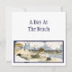 A custom invitation with a vintage illustration from a storybook of a child laying on the sand at the beach. His dog swims far out in the waves.