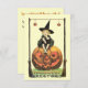 This vintage invitation features a little girl dressed as a witch setting atop of a gigantic orange pumpkin.