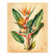 Vintage photo print of a bird of paradise plant illustration set against a tan watercolor parchment background.