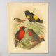 Vintage 1910 bird illustration. Red, yellow and black birds sitting on a tree branch.
