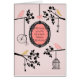 A cute and whimsical dusty pink birthday card featuring a birthday message inside a vintage frame, a birdcage, and a penny-farthing/high-wheeler bicycle - hanging from quaint branches! A classic but quite a playful card!