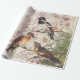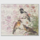 Vintage Birds sitting on branches with a background of music notes and ornate filigree elements. One bird is black and white and other two are orange and brown.