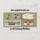 Awesome, vintage picture of a dog, fishing, golfing, ducks and Birthday Greetings on a wood plank, is featured on this Birthday postcard. Front of postcard reads, "Just wanted to wish you an old fashioned Birthday". Back of postcard reads,"Have a Great One"! A great birthday greeting to send to a male friend or family member.