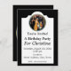 This flatcard party invitation is black with a white frame and a vintage lady in a yellow dress picking pretty pink cherry blossom flowers from a tree holding a big flowered box with a ribbon in a gold and blue circle. Customize your information with the templates.