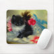 Mouse Pad featuring a playful black and white kitten! This fluffy tuxedo cat poses amongst red flowers on a blue blanket. A superb gift for cat lovers and Victorian art enthusiasts!