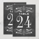 Vintage style wedding table number cards feature decorative white swirls and flourishes on both sides of the card. Background has a rustic black chalkboard textured appearance. Personalize each table number card that you need and add each to your cart individually.