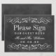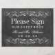 Decorative swirls and flourishes frame this elegant vintage inspired wedding guest book sign with white text and monogram. Background has a textured black chalkboard appearance.