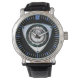 Watch with a vintage black leather strap and the picture of a rotar in the background