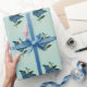 Lovely vintage gift wrapping paper features a blue butterfly resting on a flower stem with light blue background, perfect for wrapping gifts for Birthdays, Mother's Day, showers, anniversaries and more!