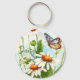 Vintage flowers and butterflies monogrammed keychain- Girly floral, vintage illustration of blue butterfly among a field of wild daisy flowers. Watercolor style floral art. Monogrammed name in elegant script, green lettering with shadow look. Nice gift for teen girl just getting her drivers license.