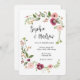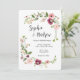 Wedding invitation featuring an elegant border of bohemian inspired flowers with poppies and burgundy and mauve flowers. Customize with your information.