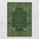 This elegant wedding menu features an ornate vintage gold frame on a distressed green background in imitation of an antique book cover. Customize the decorative gold-coloured text with your menu details. The frame design is repeated on the back of the card.