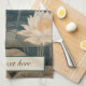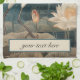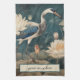 vintage painting of a botanical scene with a blue crane surrounded by white lotus flowers