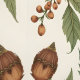 This wallpaper resembles an antique botanical print of green and brown exotic fruits, reddish-tan berries, and brown acorns among green leaves. Very beautiful, stylish, and elegant.