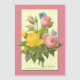 Carte magnétique avec reproduction antique de fleurs roses et jaunes, oeuvre botanique du célèbre artiste Pierre Redoute avec papillons bleus sur un arrière - plan rose.