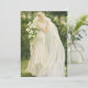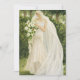 This image portrays an elegant bride standing gracefully in a lush, sunlit garden. She wears an ivory wedding gown adorned with delicate lace, subtle beading, and a softly gathered waist accentuated by a jeweled brooch. A long, translucent veil cascades behind her, catching the light and adding a sense of movement and ethereal beauty. The bride gazes gently downward at a cascading bouquet of white lilies and greenery, her expression calm and contemplative. Surrounded by dense foliage and tall trees rendered in soft, painterly tones, the scene evokes a romantic, timeless atmosphere inspired by classical illustration and Art Nouveau aesthetics.