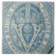 Beautiful blue and white lattice patterned old three pence postage stamp featuring ornate crown and V for Victoria from our British Columbia Collection