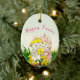Use this spring season ornament for your Easter tree. This darling ornament features two darling bunnies with colourful flowers and green grass. Personalize ornament with your own words or buy as shown with a Happy Easter greeting