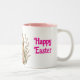 Pretty, vintage picture of a bunny with a colored egg, sitting in flowers, is featured on this two tone mug for Easter. With message, "Happy Easter", on each side of the picture with a white background and the inside of the mug in pink, makes this a great mug to use yourself or give as a gift for the Easter holiday too!