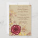 This 5x7 Wedding Invite has a vintage red / maroon rose at the bottom left corner with lots of burgundy rose and flower outlines all along the bottom and left side. There are faded tan butterflies flying around as well. The background has a tan burlap colour with some worn cross hatch marks. On the right, you can easily customize all of the wedding ceremony information. This is featured on linen paper, but you can change that out to whatever you'd prefer.