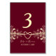 Vintage, chic, elegant, red burgundy wedding table number with gold rope heart and gilded floral lace.