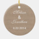 This elegant ornament features a burlap textured background and a lace décor for a stylish effect. The timeless design makes a perfect gift or keepsake for a couple that got engaged, got married or is celebrating an anniversary. Add a picture of the couple on the front and the names and date on the back.