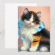 Card featuring a cute calico kitten. The kitten wears a blue ribbon while sitting adorably on a table. A perfect gift for cat lovers and Victorian art enthusiasts!