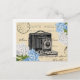 A great vintage camera with beautiful blue and white vintage hydrangeas and leaves is set on a vintage French postcard in sepia cream with handwriting and postmarks to make a lovely floral French themed postcard..