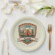 These personalized paper plates feature a scout-style badge with a cozy tent among tall pine trees. The shield-shaped badge showcases a customized name banner. With earthy retro hues, this adventure-ready design is perfect for kids' camping trips, birthdays, or summer camp keepsakes.