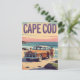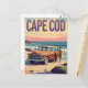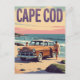 A highly nostalgic, vintage-style travel poster featuring an artistic illustration of Cape Cod, Massachusetts. The design captures a perfect summer day with a classic woodie station wagon parked on the beach, with surfers heading to the waves beneath a beautiful sunset sky. This retro-inspired artwork is perfect wall décor for travel enthusiasts, fans of New England and surf culture, and those who appreciate mid-century modern aesthetics and coastal art prints.