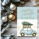 Your friends and family will adore this fun Vintage Holiday card with a personalized photo on the back. This card features a fun retro watercolor car carrying a tree with splashes of gold and a pretty soft blue background.