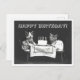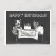 This postcard is a reproduction of a vintage black-and-white photograph showing two cats dressed in clothes sitting at a table with a birthday cake.