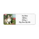 Return Address Labels featuring a vintage kitten illustration. A fluffy white cat with dark stripes plays in a patch of grass with red flowers. A cute gift for cat lovers and Victorian art collectors.