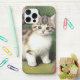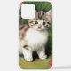 iPhone Case featuring a vintage kitten illustration. A fluffy white cat with dark stripes plays in a patch of grass with red flowers. A cute gift for cat lovers and Victorian art collectors.