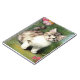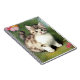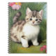 Notebook featuring a vintage kitten illustration. A fluffy white cat with dark stripes plays in a patch of grass with red flowers. A cute gift for cat lovers and Victorian art collectors.
