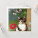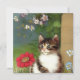 Card featuring a cute kitten illustration. A white cat with dark brown stripes relaxes in a garden of spring flowers. A perfect gift for cat lovers!