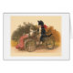 A vintage illustration of two cats riding an old-fashioned three-wheel bicycle with a chair on the front. One cats pedals and steers the bicycle while the other enjoys the ride in the chair with a warm blanket over its legs. This card is blank inside for your own message.