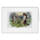 A vintage illustration of a whimsical scene of cats on their hind legs playing soccer on a soccer field. Two cats square off with the ball between them. The card is blank inside for your handwritten message.