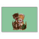This vintage image has a cute female yellow striped cat offering her brown male cat friend a gifts of a dead rat from her green basket which has more rats. The background is a mint green. See my store Art by MAR for matching products with this design.