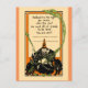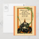 A lovely, vintage, invitation of an old witch, wearing a black cloak, and a pointed hat. She has white hair, and she is holding a wooden staff. The witch is brewing a skeleton, into a giant, black cauldron. She is with her familiar animals, a black owl, and a black cat. Green smoke, or steam, is coming out of the cauldron skeleton's eye sockets. On the greeting, it says, "Hallowe'en's the night for revels, join the fun! We want all our friends to be here, you are one!" Great for those who love old, vintage greetings, witches, owls, black cats, skeletons, or spooky Halloween stuff.