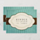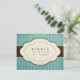 This wedding invitation response card features a striped blue background on which a dark chocolate brown ribbon bears a white emblem with scalloped edges. This curved, symmetrical form, which looks like a paper cut-out, frames the words "Kindly respond [by - customizable date]" with a swirly script flourish on the front. On the back is a line for the guest to write their name and check whether they accept or decline, and the number of guests attending. The design has a distressed, vintage, aged feel which complements the theme of simple, old-fashioned elegance.