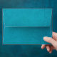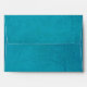 This vintage style, charming design features an aged, textured, and distressed bright blue outside, while the inside is of bold vertical bright red and cream stripes, giving the envelope a fanciful, stylish feel. The back flap has a ticket-like outline framing your name(s) and return address. The front has been left blank for addressing and postage. This envelope was designed for a matching wedding invitation.