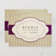 This wedding invitation response card features a striped aubergine and cream background on which an aubergine purple ribbon bears a white emblem with scalloped edges. This curved, symmetrical form, which looks like a paper cut-out, frames the words "Kindly respond [by - customizable date]" with a swirly script flourish on the front. On the back is a line for the guest to write their name and check whether they accept or decline, and the number of guests attending. The design has a distressed, vintage, aged feel which complements the theme of simple, old-fashioned elegance.