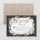 Vintage Cherish White Floral & Rose Gold Painted Roses and Flowers. A Vintage Classic and Elegant Look, and Plenty of Grey, Ivory White, Rose Gold, Dusty Pink, Pine Green, and Grey leaves and foliage. With Hand Painted Floral elements, Vintage Classic Script Fonts, and Elegant Rose Gold Glitter Foil Oval Frame On a Charcoal Dark Grey Almost Black Colour Editable Background- Wedding RSVP Cards!
