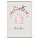 Antique style wedding table card featuring a vintage illustration of cherry blossom with ribbons and love birds on coral pink / peach, brown and cream.
