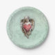 A uniquely charming vintage design with a cherub presenting a weathered red heart. Surrounded by subtle baroque flourishes and frame, the background is a rustic grunge texture in shades of aqua with grey overtones. This plate is a wonderful choice for Valentine's Day parties, weddings, engagements, anniversaries and other romantic occasions. This paper plate is available in two sizes: 7" and 9". Be sure to choose the size that suits your event and requirements. The 9" plate is better for serving hors d'oeuvres or party food and the 7" plate works well for serving cake.