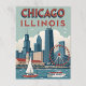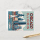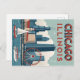 This postcard features a charming vintage-style illustration of the Chicago, Illinois skyline. It depicts iconic elements such as a boat on the water, prominent buildings, and what appears to be a Ferris wheel, all under a blue sky with birds. The text "CHICAGO ILLINOIS" is prominently displayed vertically on the right side of the image.
