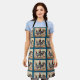 This apron sports a pattern from a vintage illustration of a speckled black and white rooster and a hen.