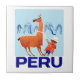 Vintage and whimsical 1950's travel poster depicting a reluctant llama and handler in the Andes mountain range.